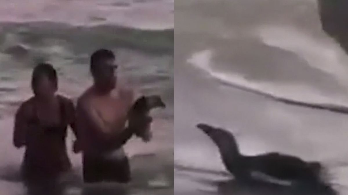 En las imágenes se puede ver al hombre luchando para agarrar al pingüino en el mar mientras era acompañado por su pareja, que se reía de la situación. Luego de unos segundos, lograron llevar a la fuerza al ave a la orilla y lo apoyaron sobre la arena.