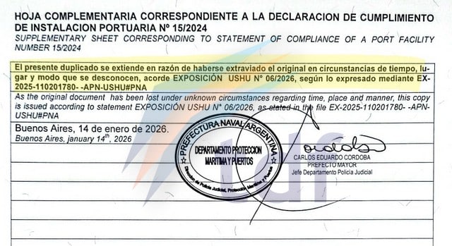 Un documento oficial de la Prefectura Naval Argentina, emitido en enero de 2026, certifica que la terminal portuaria de Ushuaia cumple con las normas internacionales de seguridad. El original del informe no pudo ser localizado, por lo que se emitió un duplicado a solicitud de trabajadores portuarios.