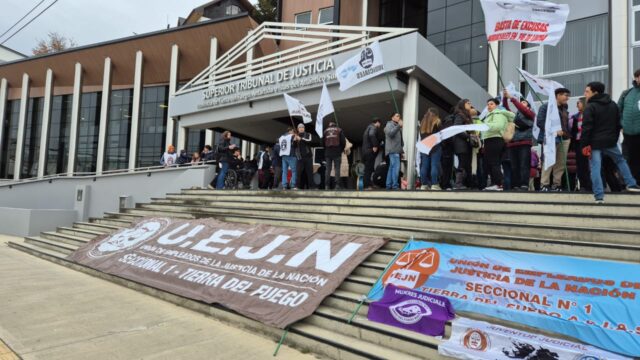 En el marco del paro por 48 horas decretado por la Unión de Empleados de Justicia de la Nación, los trabajadores judiciales se movilizaron al edificio de la máxima corte en la ciudad de Ushuaia. Tras una nueva semana con medidas de fuerza, se manifestaron en la sede en reclamo de una recomposición salarial.